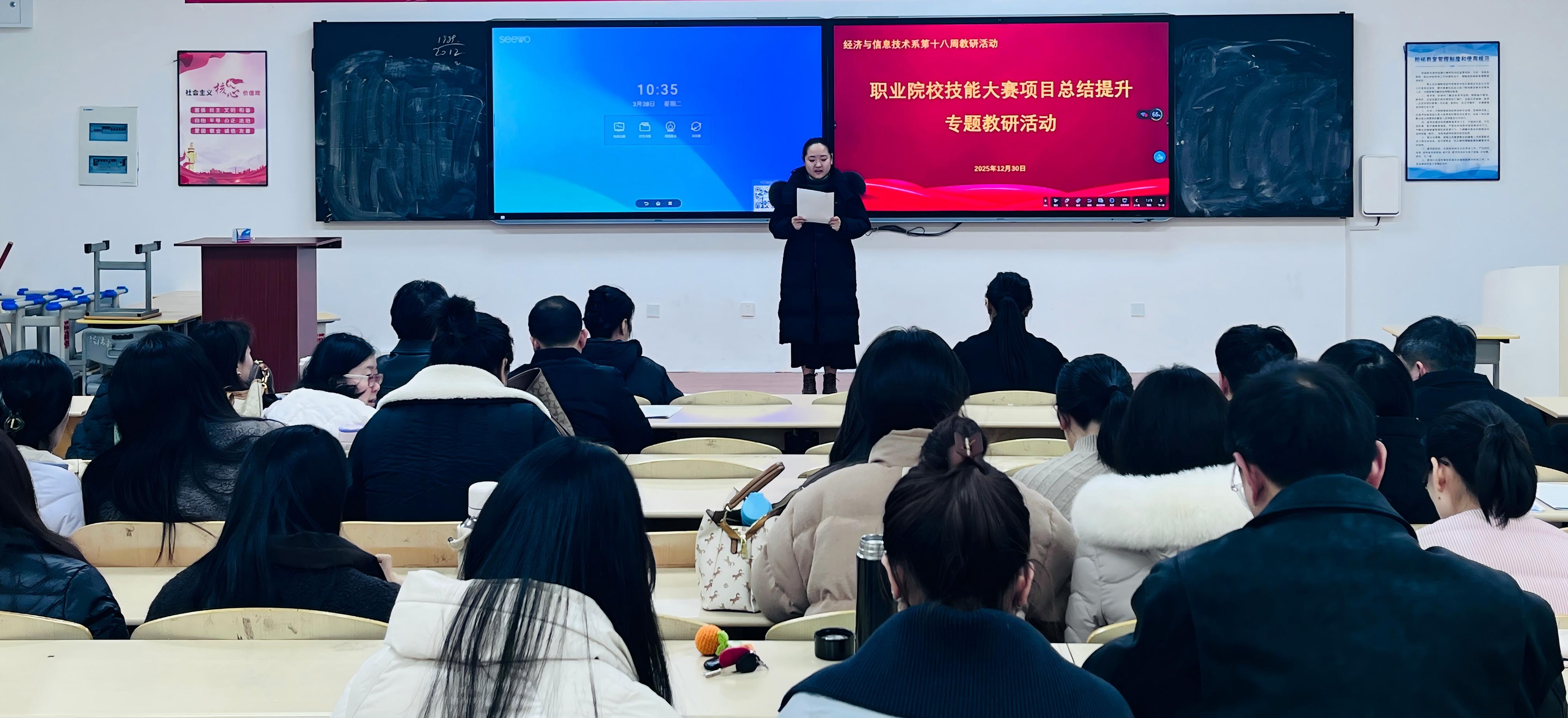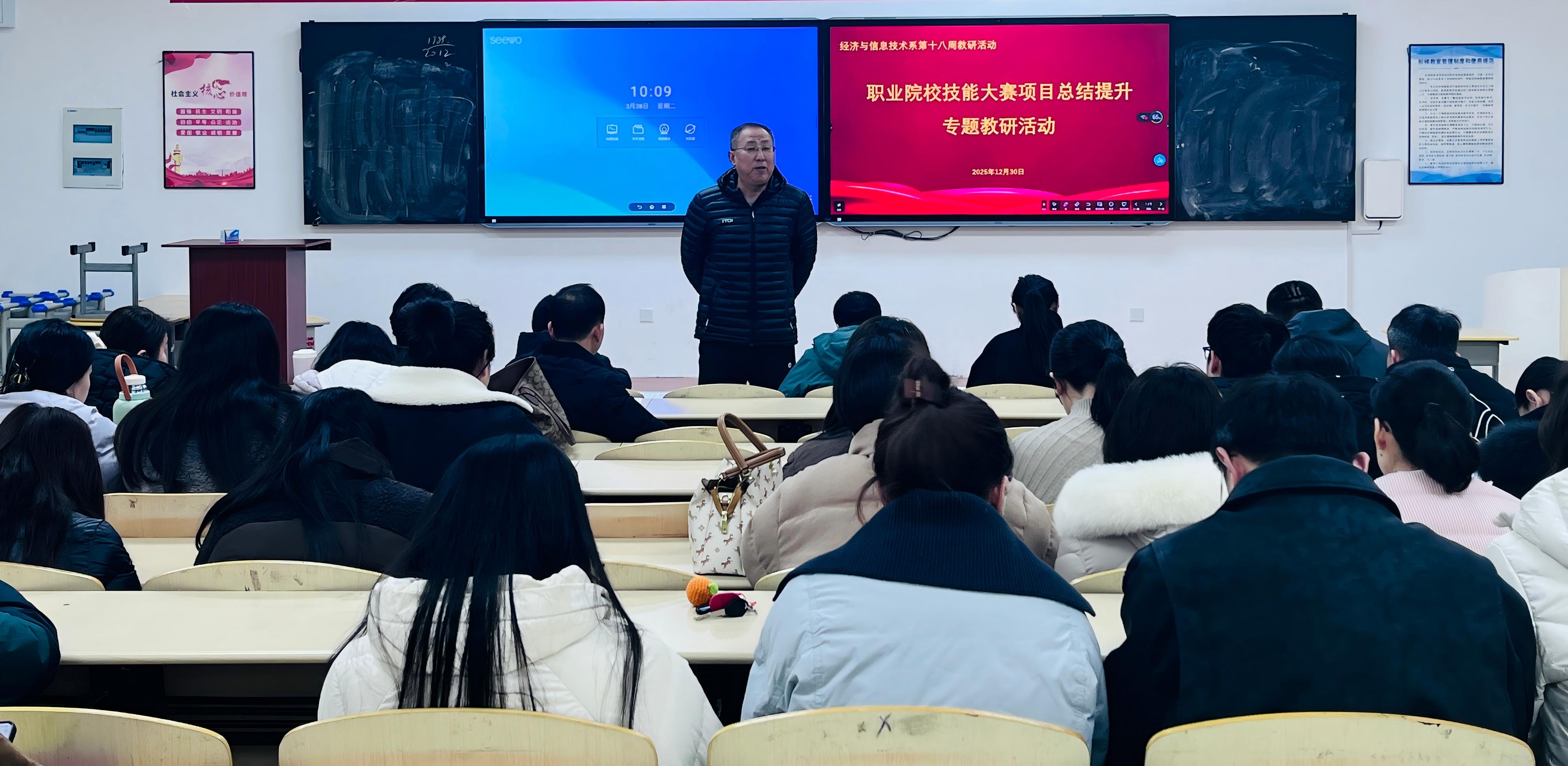 12月30日,经济与信息技术系在JA202教室开展“技能大赛项目总结提升”专题教研活动。活动由系主任杜卫东主持,全体教师共同参与。