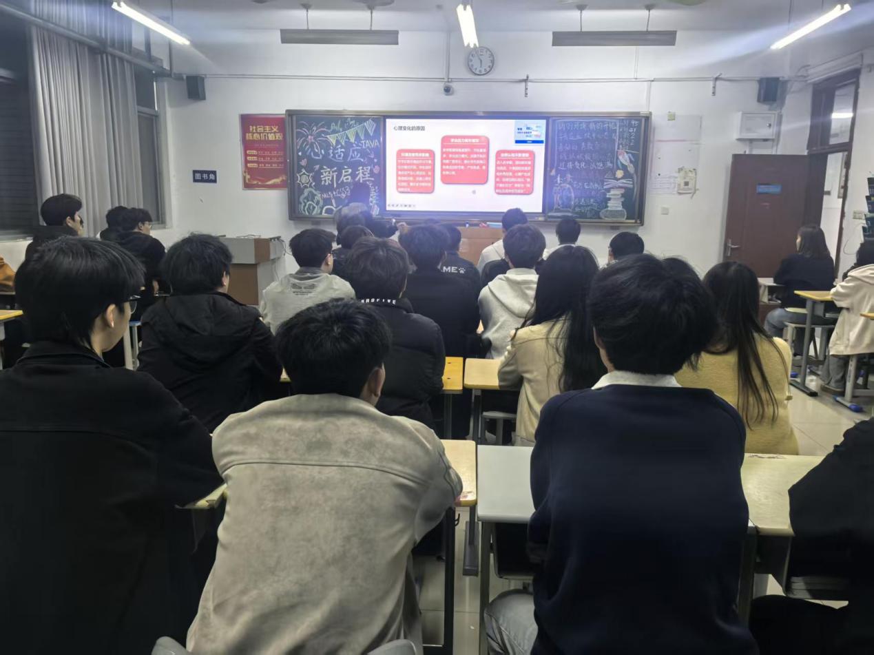 3月22日,经济与信息技术系各班级利用晚自习期间分别在教学楼A座和B座同步开展了以“心适应,新启程”为主题的心理班会。