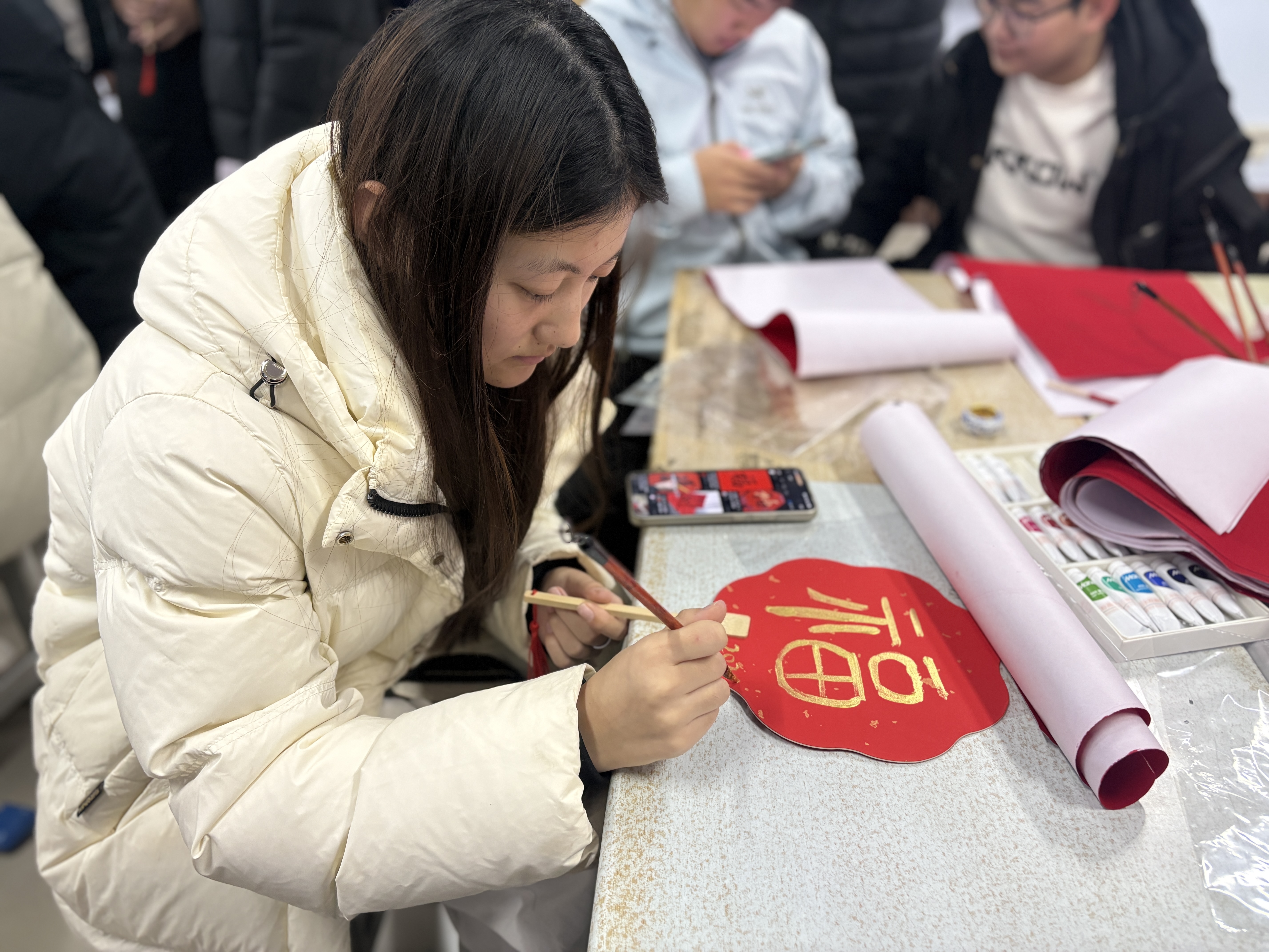 活动期间,同学们围绕对联书法、扭扭棒创意制作、漆扇创作等传统文化项目展开,通过动手实践和互动交流,生动展现了传统艺术与创意手工在新时代的活力与风采。