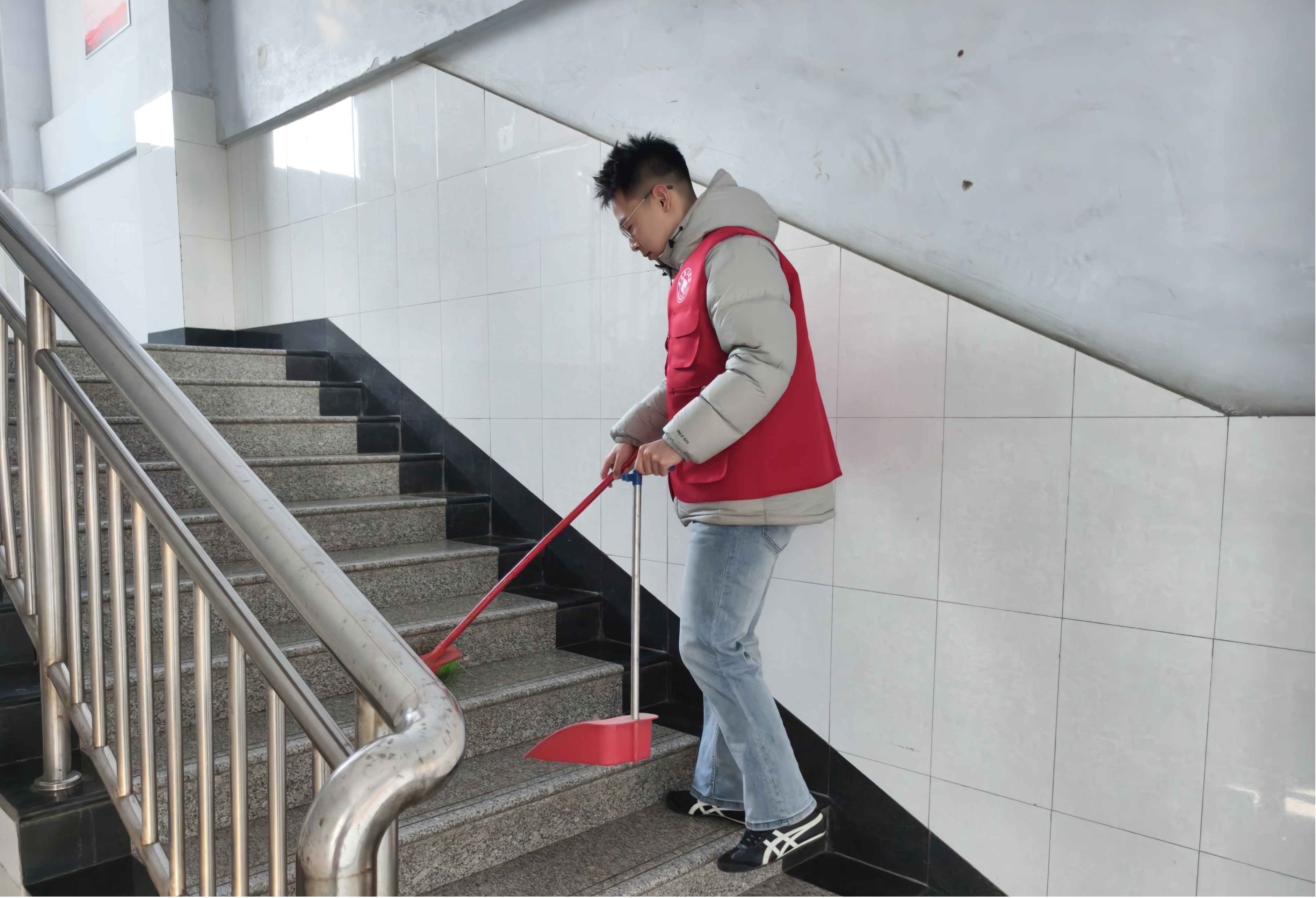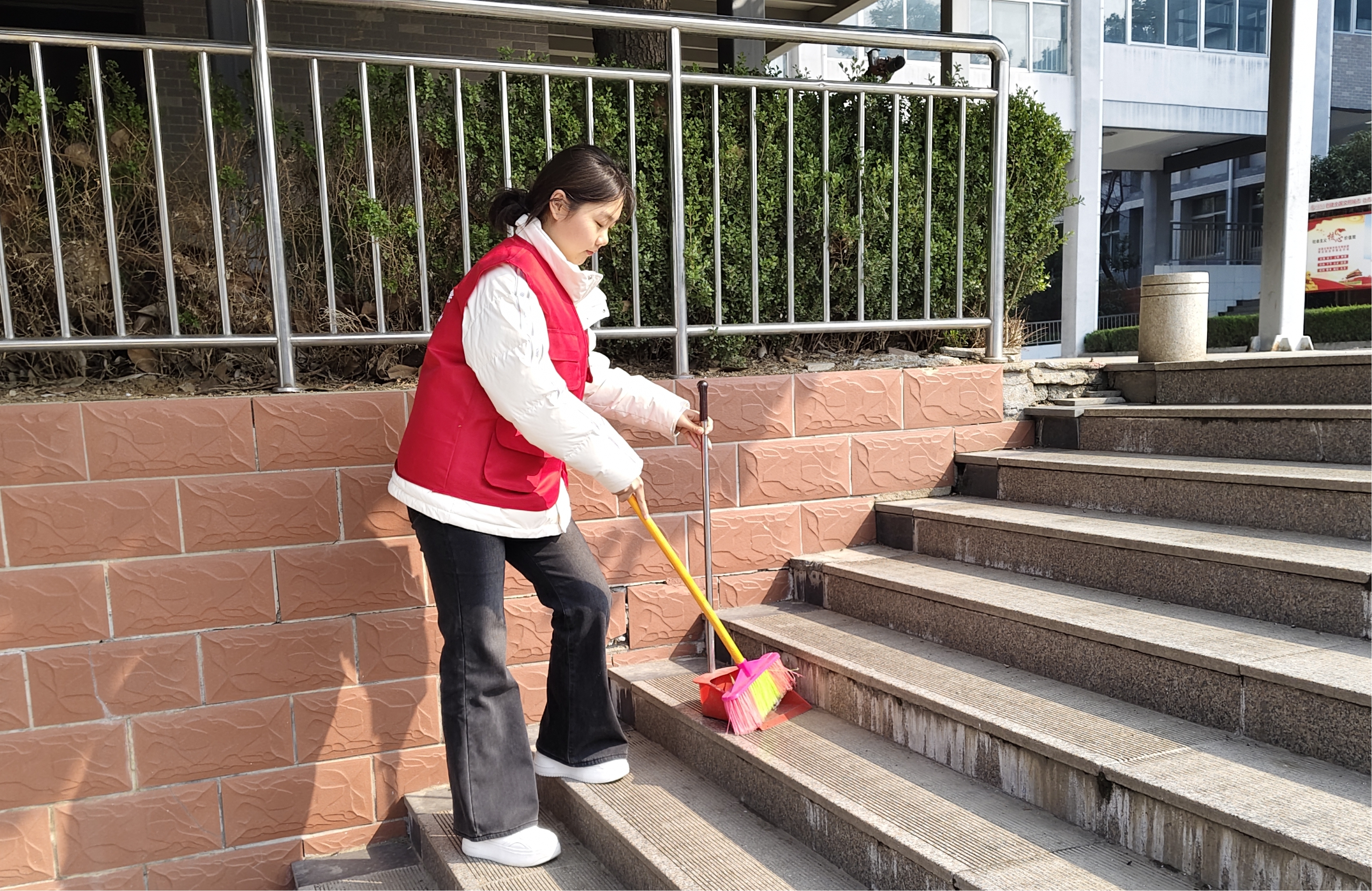 活动现场,志愿者们身着红色志愿马甲,手持扫帚、簸箕等清洁工具,以饱满的热情投入到劳动中。大家分工明确、配合默契,形成了一道靓丽的红色风景线。有的专注清扫教学楼周边道路、台阶上的落叶与杂物;有的俯身细致清理楼道角落的隐藏垃圾,还原整洁环境。